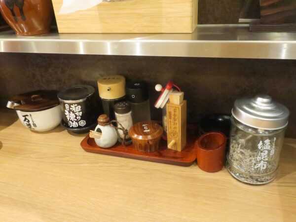 こちらのお店では、各客席に多数の調味料等が並んでいます。